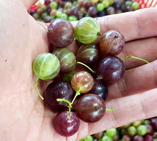 6월에서 7월 사이에 익는 구스베리는 크기가 1.5~2cm 정도이고, 비치볼처럼 줄무늬가 있어요. 완전히 익으면 황색, 적색, 녹색 등 다양한 색깔을 뽐낸답니다. 달콤함도 높아서 그냥 먹어도 맛있어요!